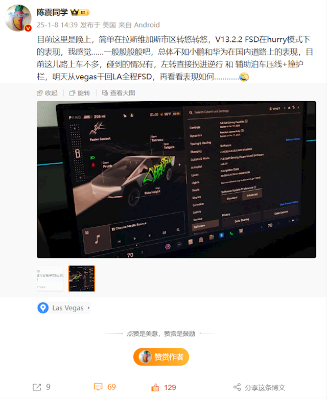 快科技1月12日消息,汽车博主陈震透露,参加2025 CES期间,他在美国拉斯维加斯市区体验了特斯拉Cybertruck的FSD自动驾驶功能。