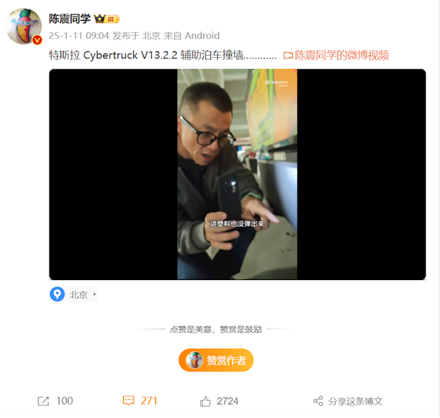 事实上,对于特斯拉FSD的表现,陈震并不满意。陈震前几日还曾发文称,夜间路上车不多,但特斯拉FSD碰到的情况有,左转直接拐进逆行、辅助泊车压线、撞护栏。